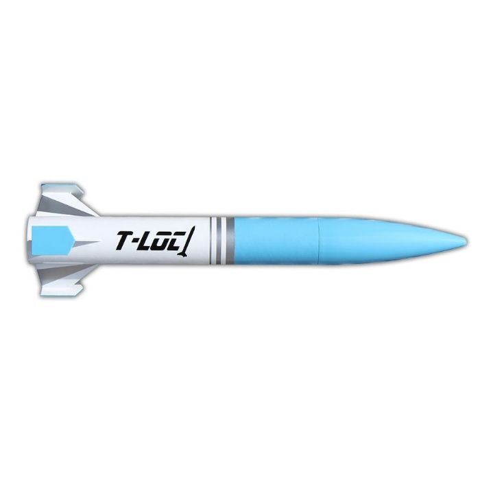 T-LOC is a slightly different take on a 3 fin/cone rocket. Adding outside stabilizer makes this a super straight shot! Recovery is a newly designed 28″ ripstop nylon parachute with central spill hole making decent as straight as your ascent. Packed with features including rail guides, motor retention, vinyl decals and more! Standing 37″ tall, 29mm mount makes this a great flyer for hobby size motors. Don’t be fooled….you can still achieve Level 1 certification with this rocket.